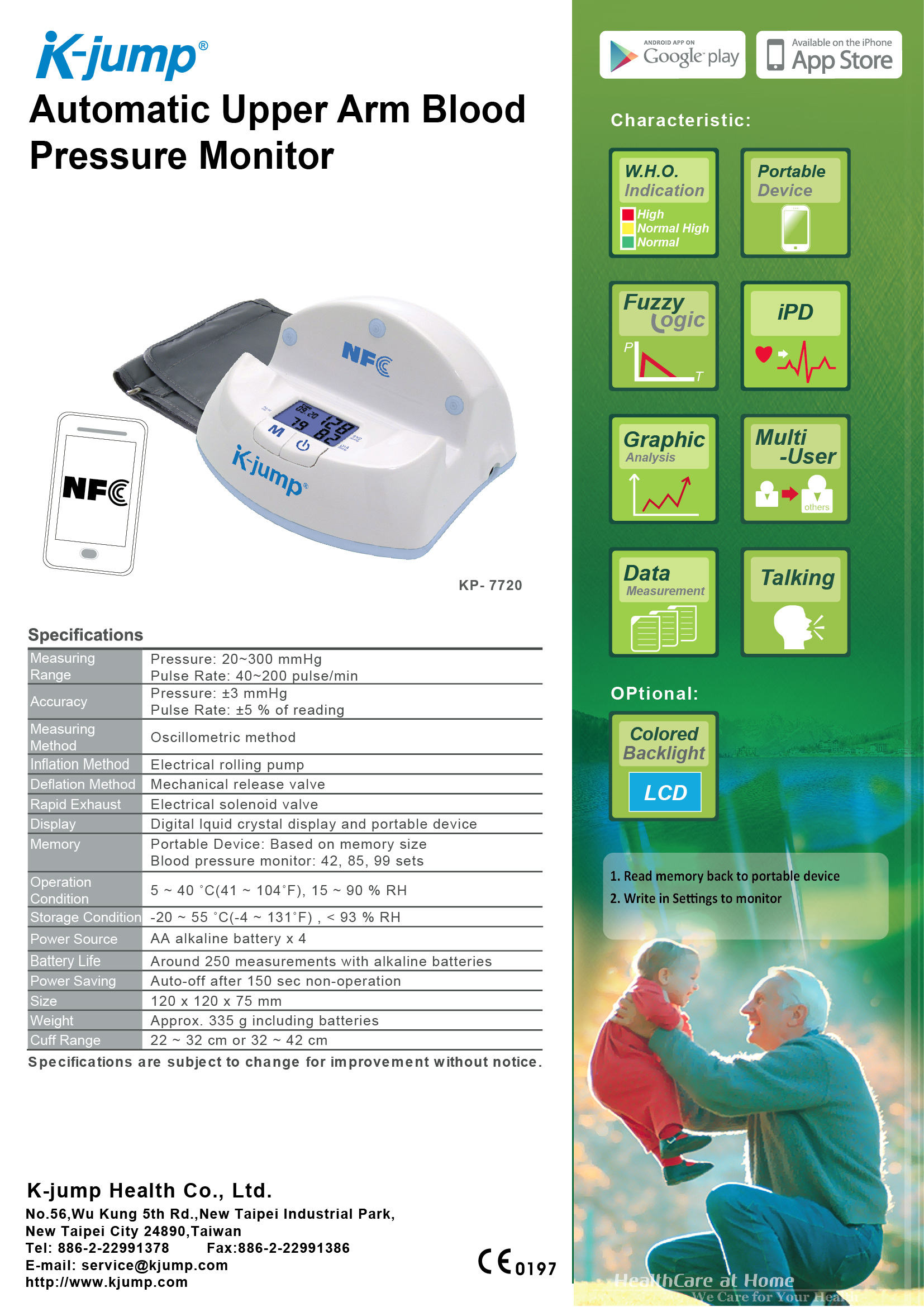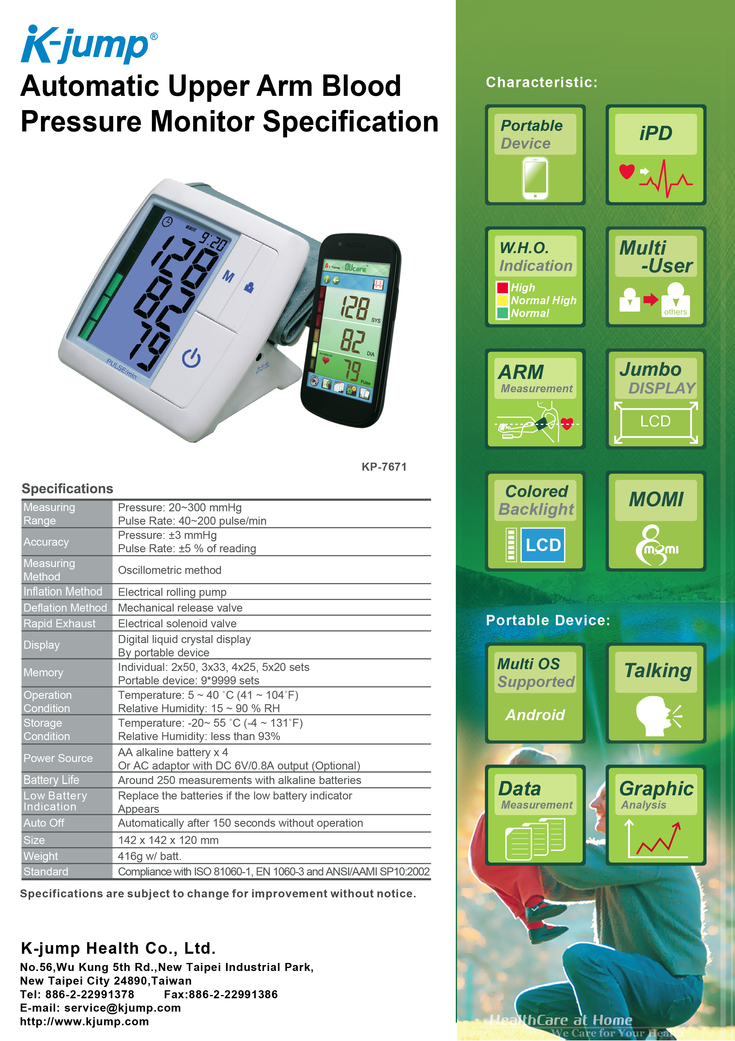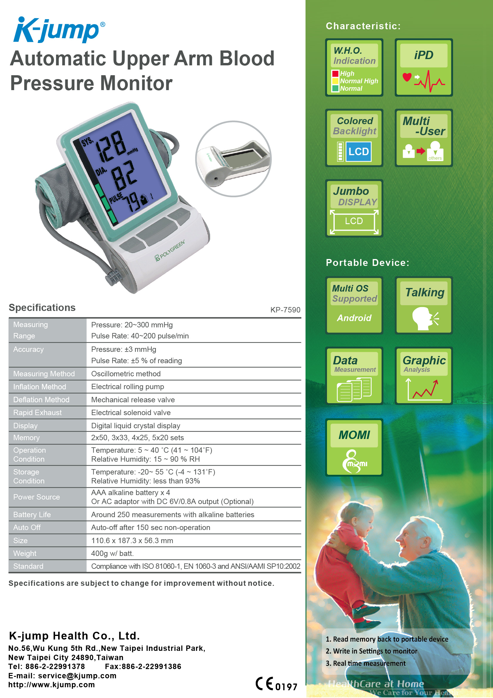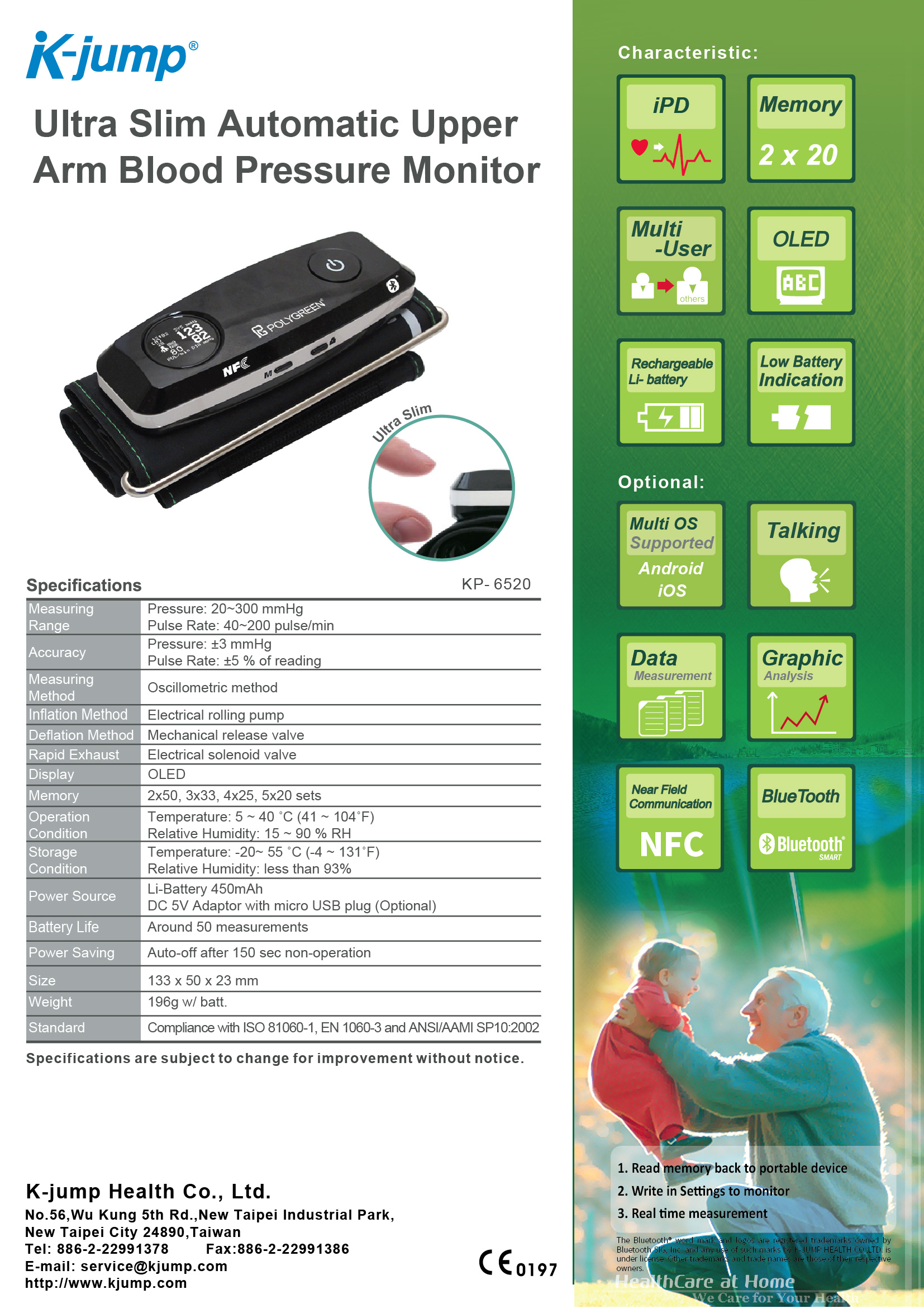 • Novel & Ultra slim design • Jumbo display • Folding stand for better view angle • W.H.O. Indication • Irregular Pulse Detection • Multi-User with memory Optional Functions: • Colored backlight • NFC & Bluetooth • Data Management • Support both Android and iOS