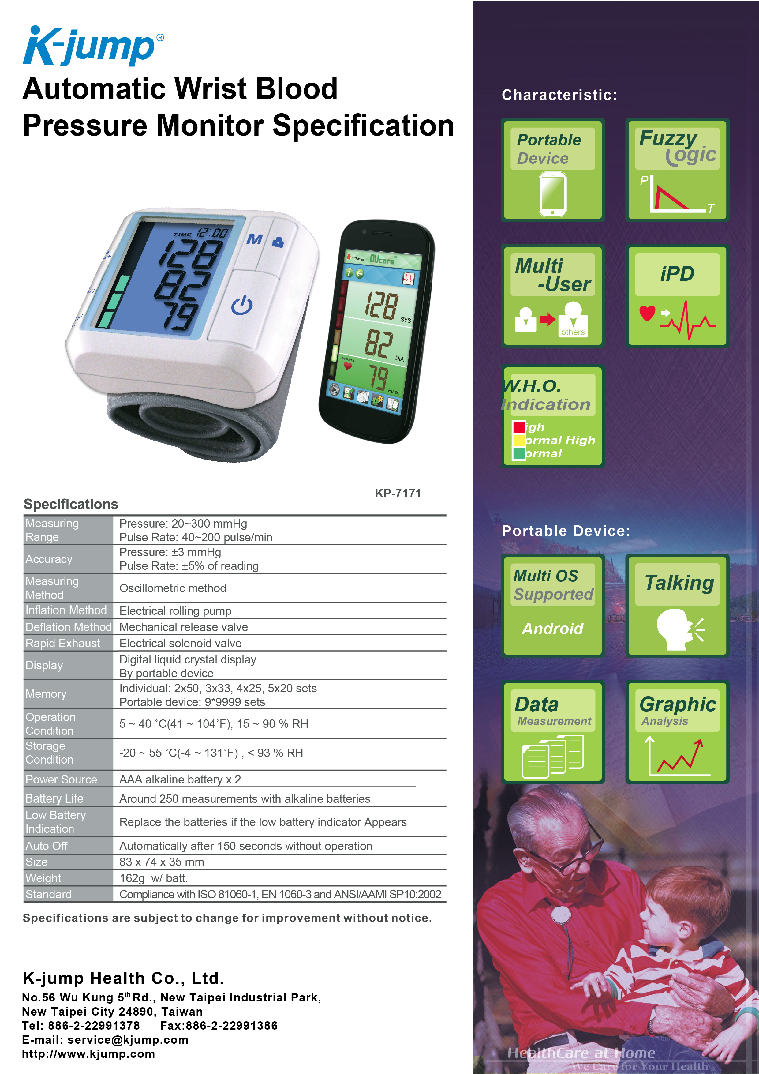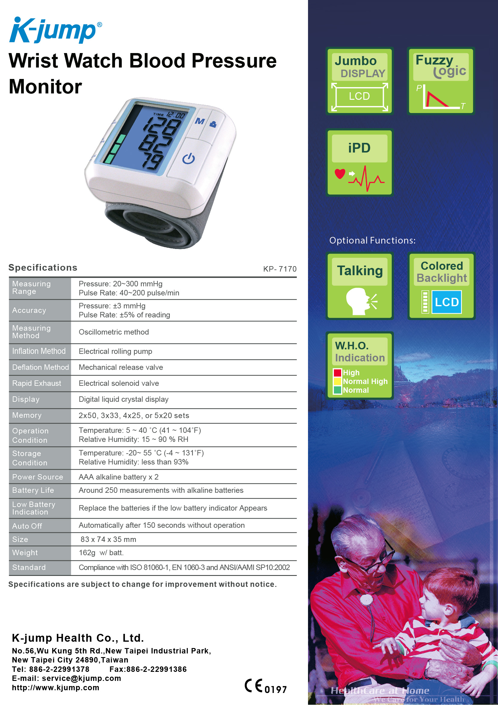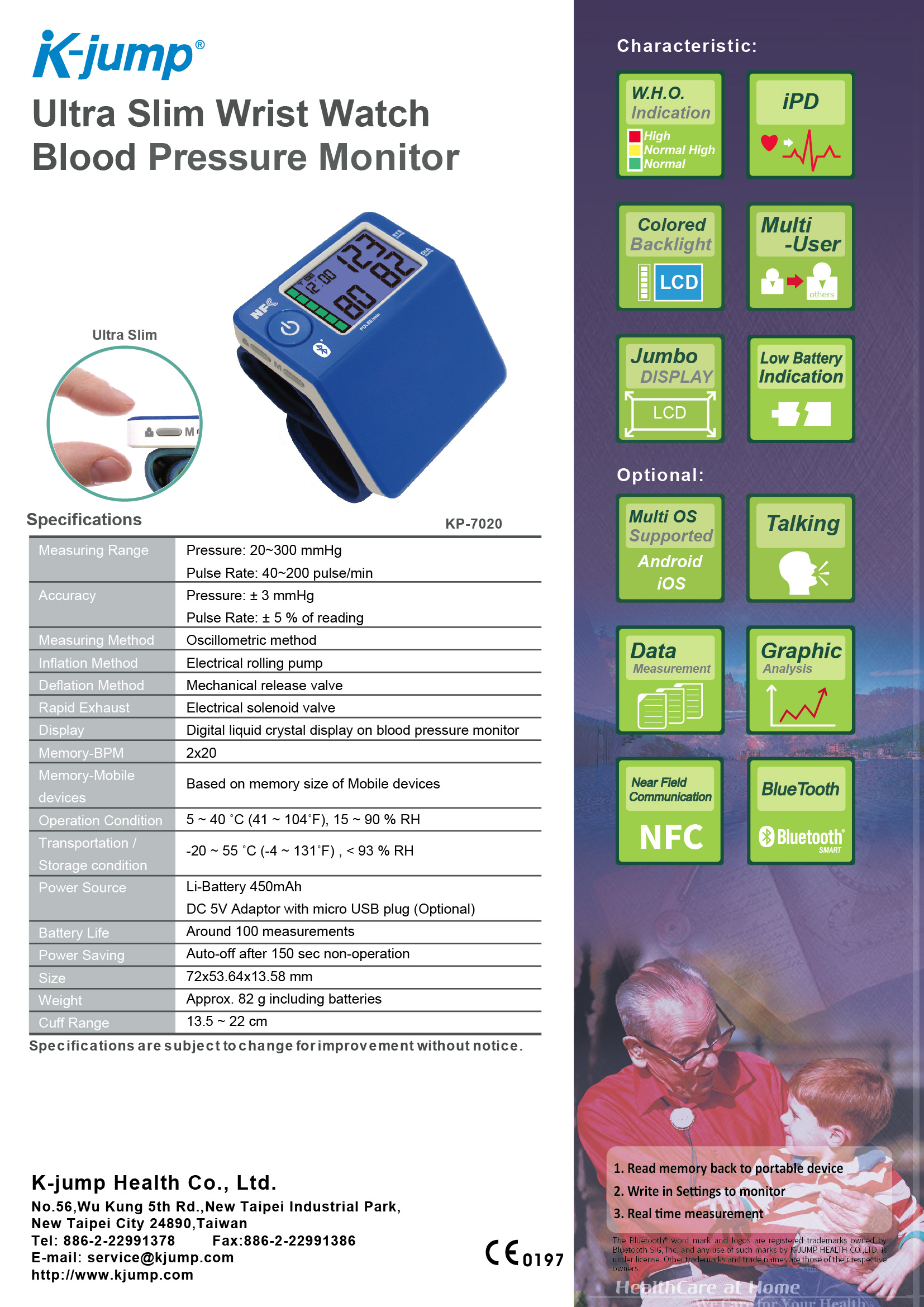 • Jumbo digit display • Irregular Pulse Detection • Multi-User with memory • W.H.O. Indication • Talking in different languages (Optional) • NFC & Data Management (Optional) • Support both Android and iOS mobile systems (Optional)